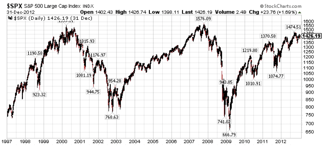 One last point getting back to stock market valuations. If you want a guaranteed derisive eyeroll from in-the-know investors, start talking about the Shiller CAPE ratio (Cyclically Adjusted Price-to-Earnings ratio, or effectively the 10-year P/E on the S&P 500 Index). I can barely restrain my own eyes darting to the ceiling as I type this point. But here’s the thing we cannot ignore. First, let’s get this out of the way. The Shiller CAPE ratio is NOT a market timing instrument. It’s not about what’s going to happen tomorrow, next week, or next year. Instead, it is an ultra long-term indicator. It gives us a measure of what we should reasonably expect over the next ten years. What is the CAPE approaching 40 telling us today? That the expected return on the S&P 500 over the next 10-years should come in around 1.6%. The only time this reading has been lower was in 2000, 1970, 1937, and 1929. It’s been four out of four in its past 10-year market return predictions. But the more important point to note is that when generating a 1.6% annualized return over a ten year period, it almost never comes in a grinding slog of successive 1% to 2% returns each year over ten years. Instead, it almost always comes with years that are down -20% to -40% followed by years that are up +15% to +30%. A price chart from 1997 to 2012 is what it typically looks like.