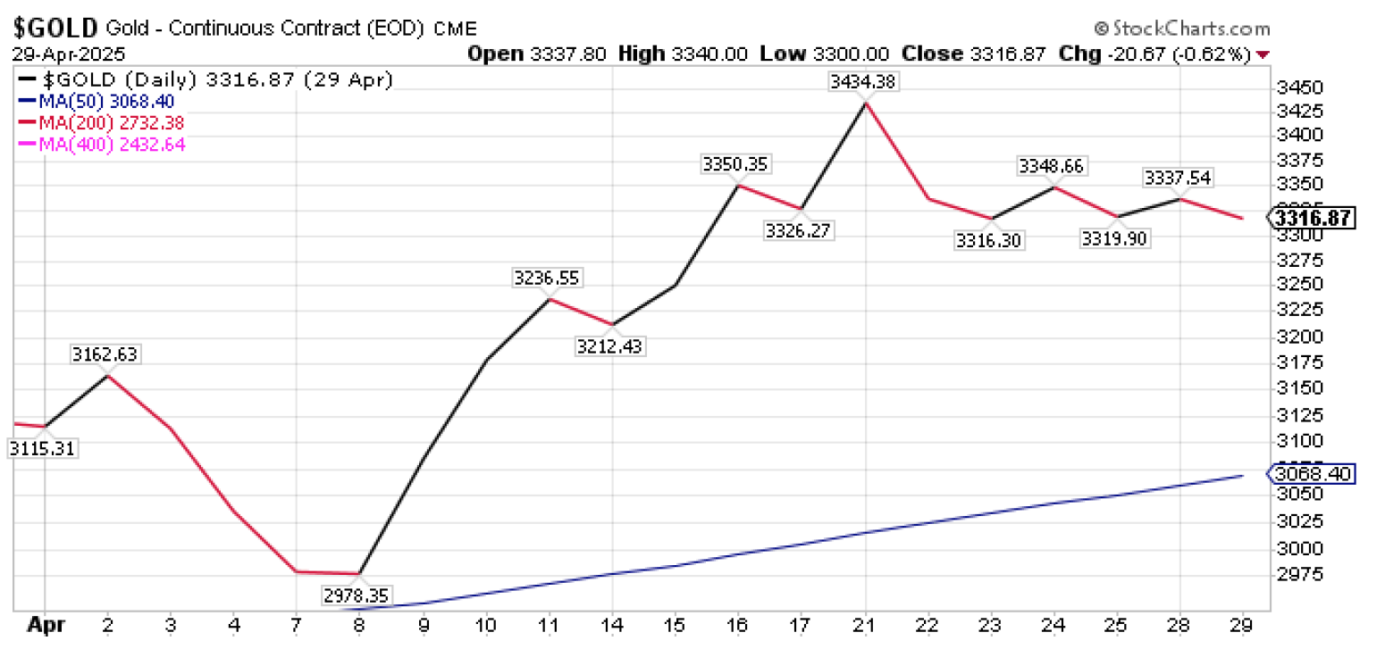Commodities did not escape the Spring storms. Oil prices faced significant downward pressure due to announcements in supply changes from OPEC+ and Saudi Aramco. Brent crude prices plunged to their lowest levels in over four years, dropping below $60 per barrel in early April amid concerns over a potential global supply glut. Although prices stabilized at around $63 per barrel following the postponement of tariffs, the market remains volatile as investors contend with uncertainties surrounding OPEC+’s production decisions. Gold also experienced significant volatility during the month of April. In the first two days, prices trended upwards, reaching $3,160 an ounce. However, starting on April 2, the commodity slid to $2,978 per ounce before surging to an all-time high of $3,434 on April 21st. By month-end, gold was trading at approximately $3,316, reflecting continued demand for safe-haven assets.