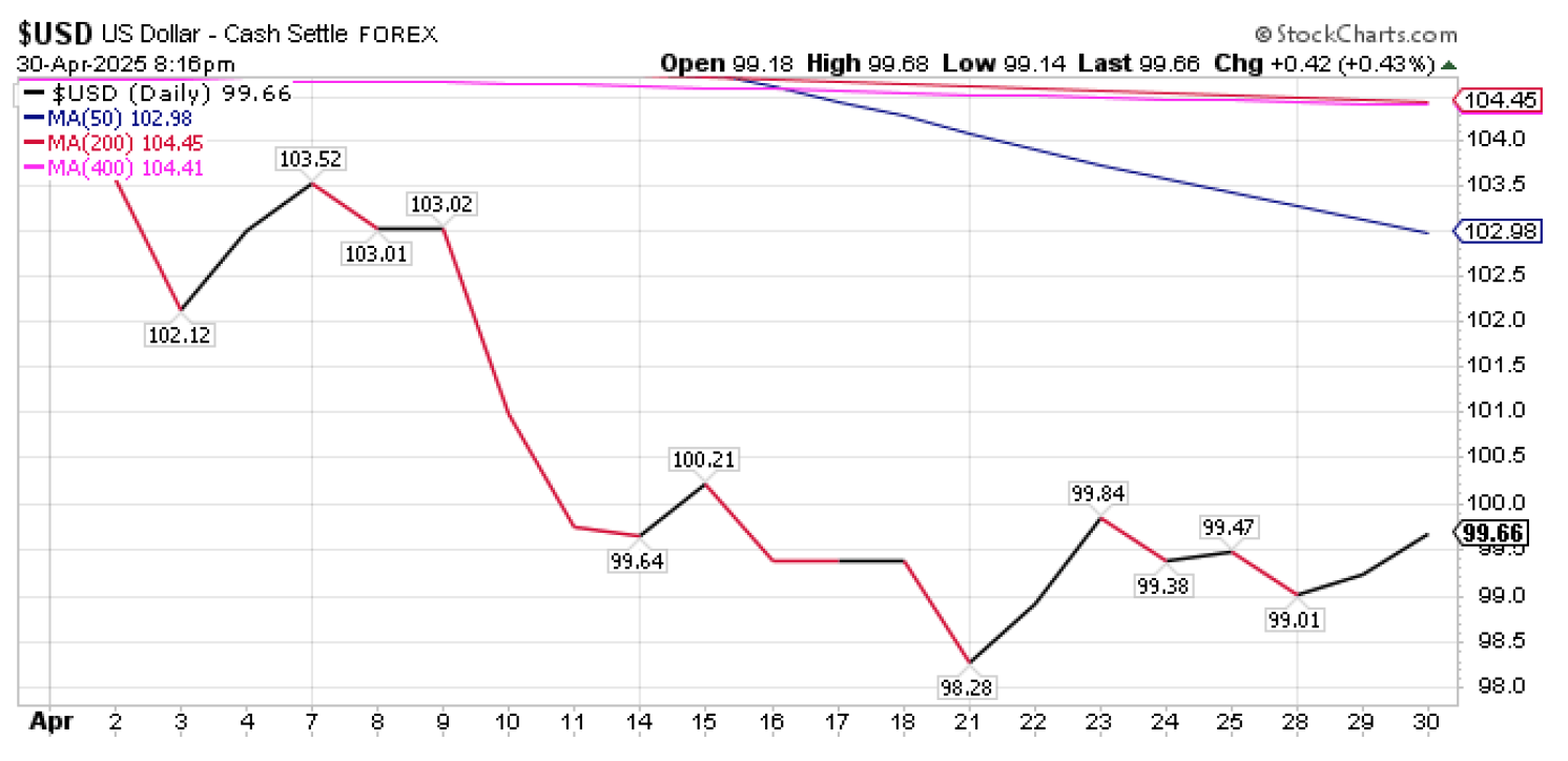 The U.S. Dollar Index (DXY) plunged to 99.2391 on April 23, its lowest level since March 2022. While a weaker dollar can boost U.S. exports by making them more competitive abroad, it also raises the cost of imports, contributing to domestic inflation. More importantly, the greenback’s depreciation reflects declining global demand for U.S. assets, including Treasuries – a signal that international investors may be reassessing confidence in the U.S. economic outlook. At the time of writing the dollar sits at $99.66.