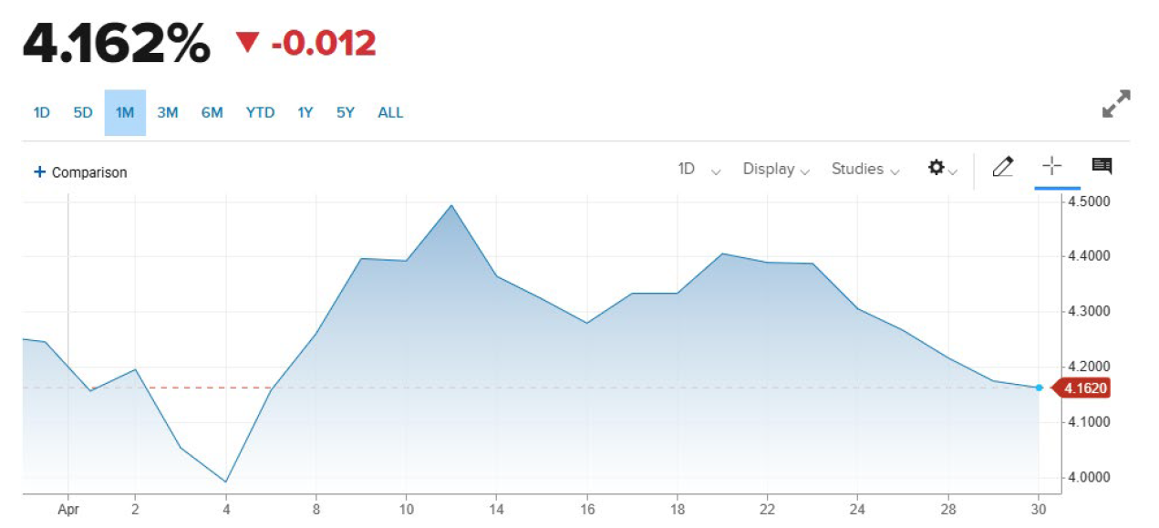 U.S. Treasury yields swung wildly during the month of April. On April 1st the U.S. 10-year closed at 4.15%. A mere three days later it was down below 4.00%, hitting 3.86% during the April 4th trading session. Following this drop, from the 5th to the 11th the 10-year yield skyrocketed past 4.5%, hitting its highest point during the April 11th trading session at 4.59%. By April 16th it had come back down to earth to close at 4.29% and at the time of writing it sits at 4.162%. Investors experienced over a 60-basis point swing in 10-year treasury yields over the span of 6 days. So, what drove these drastic shifts?