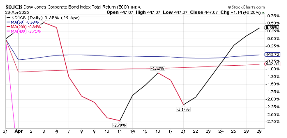 In early April, asset flows into ETFs that invest in corporate loans saw a significant slowdown, with a notable outflow. On April 4th, corporate bond ETFs experienced a record $1.3 billion in outflows, according to JPMorgan. While this may seem jarring, performance during the month of April whipsawed frequently but ended on a positive note. The Dow Jones Corporate Bond Index fluctuated, starting the month up 0.50% on April 3, before dipping to -2.70% by April 11. It regained momentum leading up to April 16, but dipped again to -2.17%, before rallying to finish the month +0.35%.