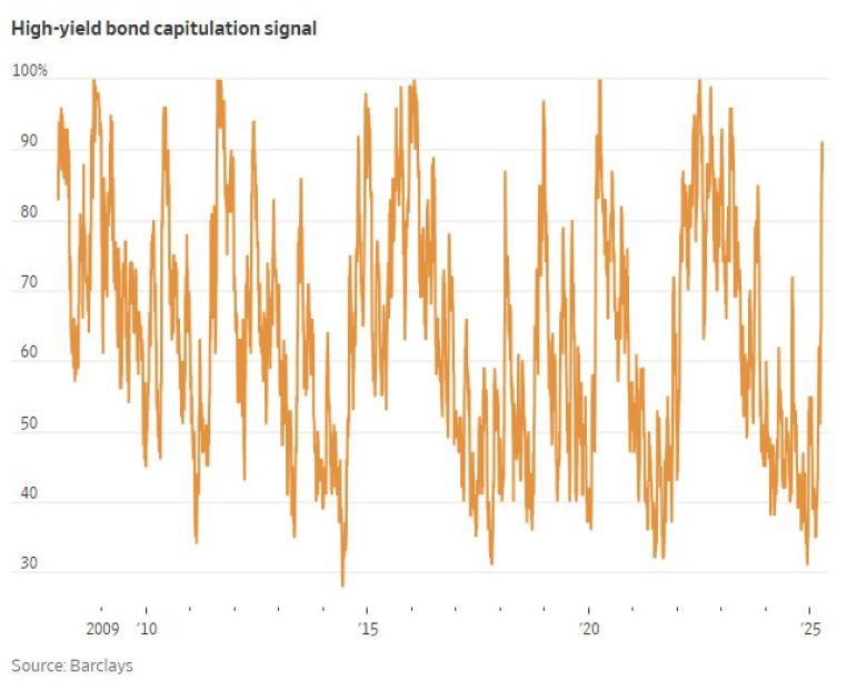 According to the Barclays high-yield bond capitulation signal, high yield credit markets neared a tipping point in early April, leading up to the 90-day tariff pause. Barclays defines “capitulation” as the point where sharp and short-term selling pushes prices lower, triggering additional selling. The indicator jumped significantly since the end of March, peaking in the low 90’s in the days following “Liberation Day”. This was the highest reading since October 2023, when Treasury yields surged on inflation concerns. At 100%, the market is in full capitulation, which has only happened five times since 2000 – during the 2008-2009 financial crisis, the 2011 European debt crisis, the plummeting of oil prices in 2016, the start of the pandemic in 2020, and when interest rates surged in 2022.
