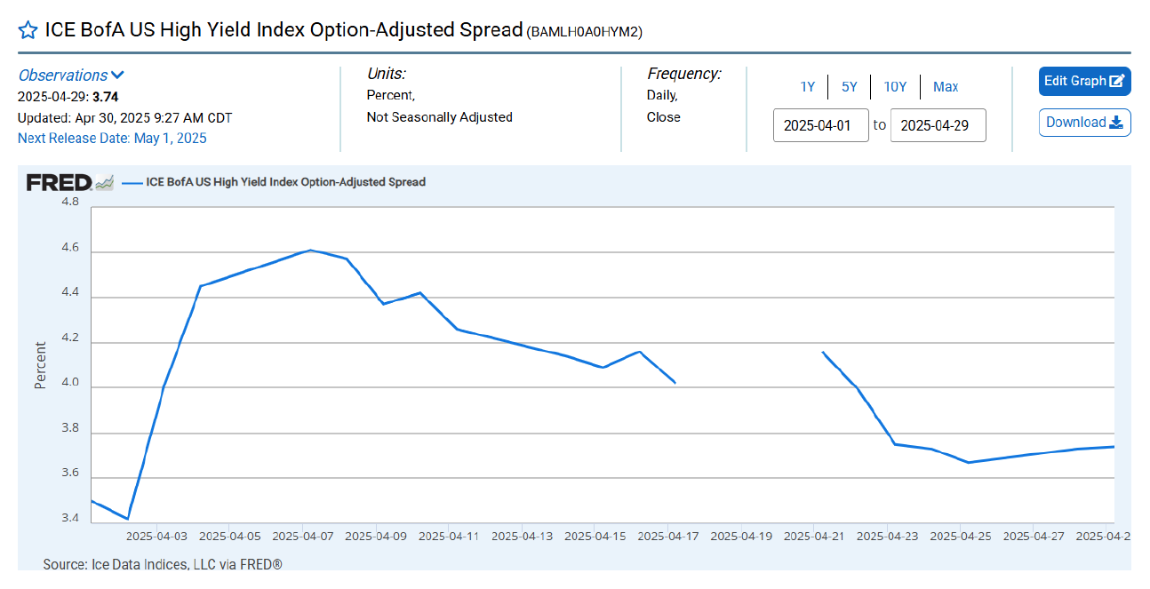 The rise in the capitulation signal coincided with the widening of high-yield spreads. The ICE BofA US High Yield Index Option-Adjusted Spread widened sharply due to investor uncertainty and a pause in bond purchases. High-yield spreads were relatively tight at the beginning of the month, hovering around 345-350 basis points over the U.S. Treasury. After the tariff announcement, spreads widened substantially, pushing toward 450-475 bps – a jump of about 100-150 basis points in just a few days. Some of the drivers leading to this blow out include the spike of the U.S. 10-year mentioned earlier, a general risk-off sentiment prior to the 90-day tariff pause, and broader growth concerns surrounding the economy which led to slower buying in fixed income. Nonetheless, spreads came back down to around 370 bps at the end of the month, only 20-25 bps higher from where we started at the beginning of April. The key range to monitor going forward will be whether high yield spreads reach territories that exceed the 800-1000 bps mark which were previously seen during the 2008 financial crisis and COVID.