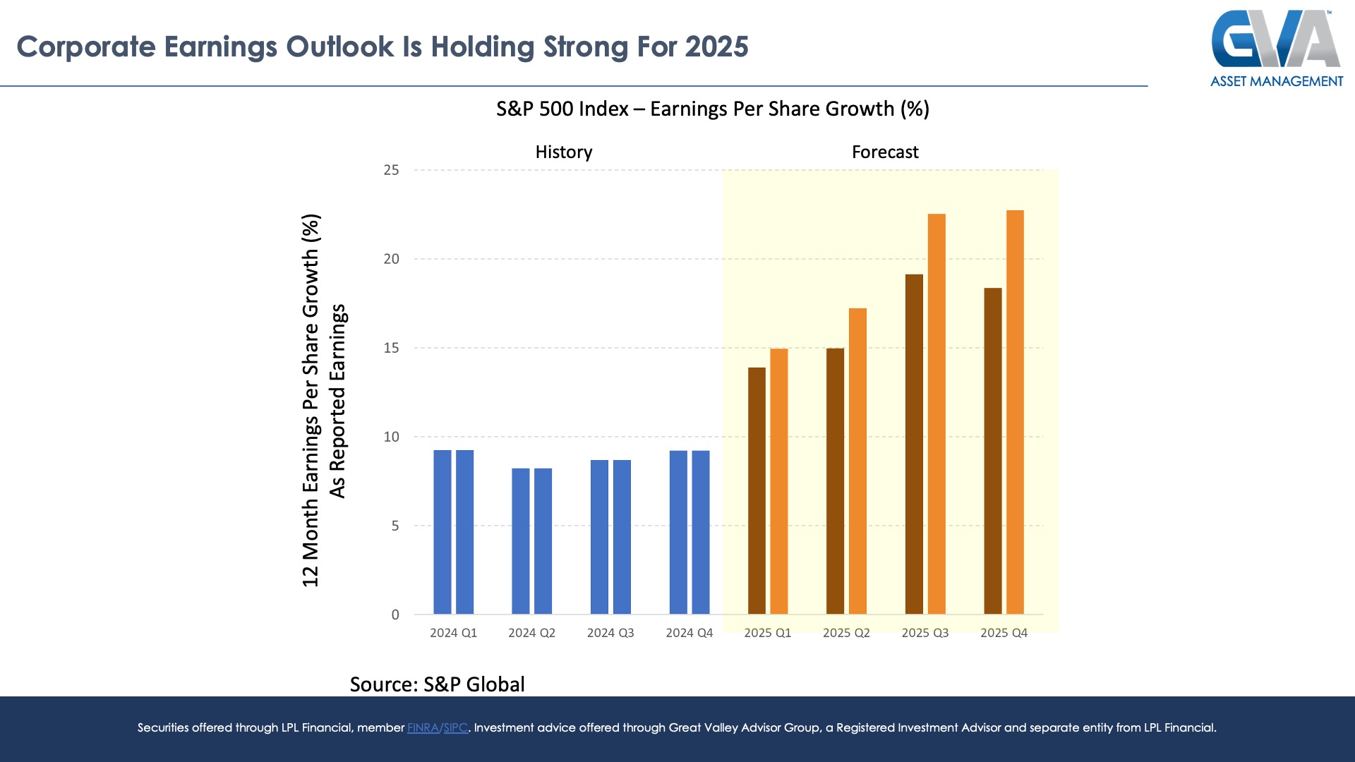 Consider the chart above showing the 2024 historical and 2025 forecasted per share corporate earnings growth on the S&P 500 Index. We are now more than half, just over 55% to be exact, through the 2025 Q1 earnings season, and the results have been highly encouraging so far. Have earnings growth projections coming into the quarter (dark red bars in the chart above) come down a bit through the first half of earnings season? Sure, but it would have been extraordinary if companies hadn’t revised their outlooks lower at least somewhat given the supposedly cataclysmic uncertainty associated with the tariff rollout just over a month ago. And the fact that corporate earnings growth is still holding in the +13% to +16% range for the rest of 2025 is decidedly encouraging (remember, we had less than 10% earnings growth throughout 2024 as shown by the blue bars in the chart above, and the U.S. stock market was up over +20% last year), as it implies that even after all of the tariff hubbub that underlying economic fundamental conditions remain strong.