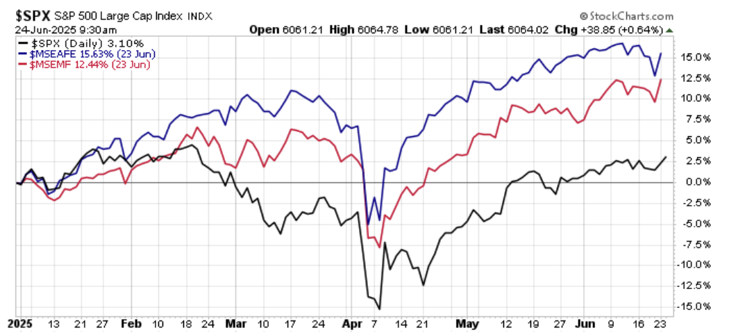 Wait a second. Haven’t U.S. markets been crushing both developed international and emerging markets on a cumulative return basis over the last 15 years? Yeah, non-U.S. markets have handily outperformed U.S. stocks so far in 2025 (see below), but didn’t we see the same thing coming out of the COVID crisis from May 2020 through February 2021, only to see U.S. stocks reclaim the throne?
